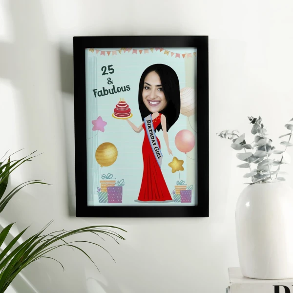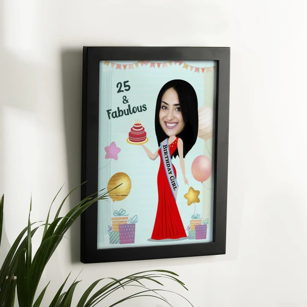 - Birthday Photo Frame Style: The caricature is seamlessly integrated into the framework of a birthday-themed photo frame, adding a festive and personalized touch.