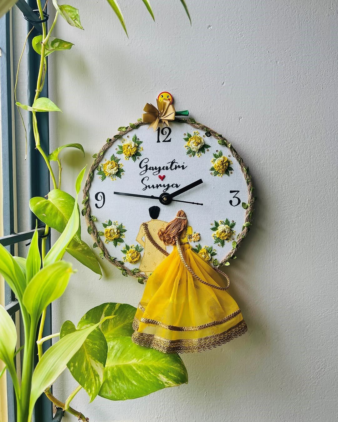 Elevate your home décor with our “Personalized Wall Clock with Couple in Yellow Lehenga Embroidery Design.” This stunning handmade creation features an intricately embroidered couple, dressed in a vibrant yellow lehenga and traditional attire, alongside customizable names. A timeless blend of art and functionality, it’s perfect for commemorating weddings, anniversaries, or as a thoughtful gift for loved ones.